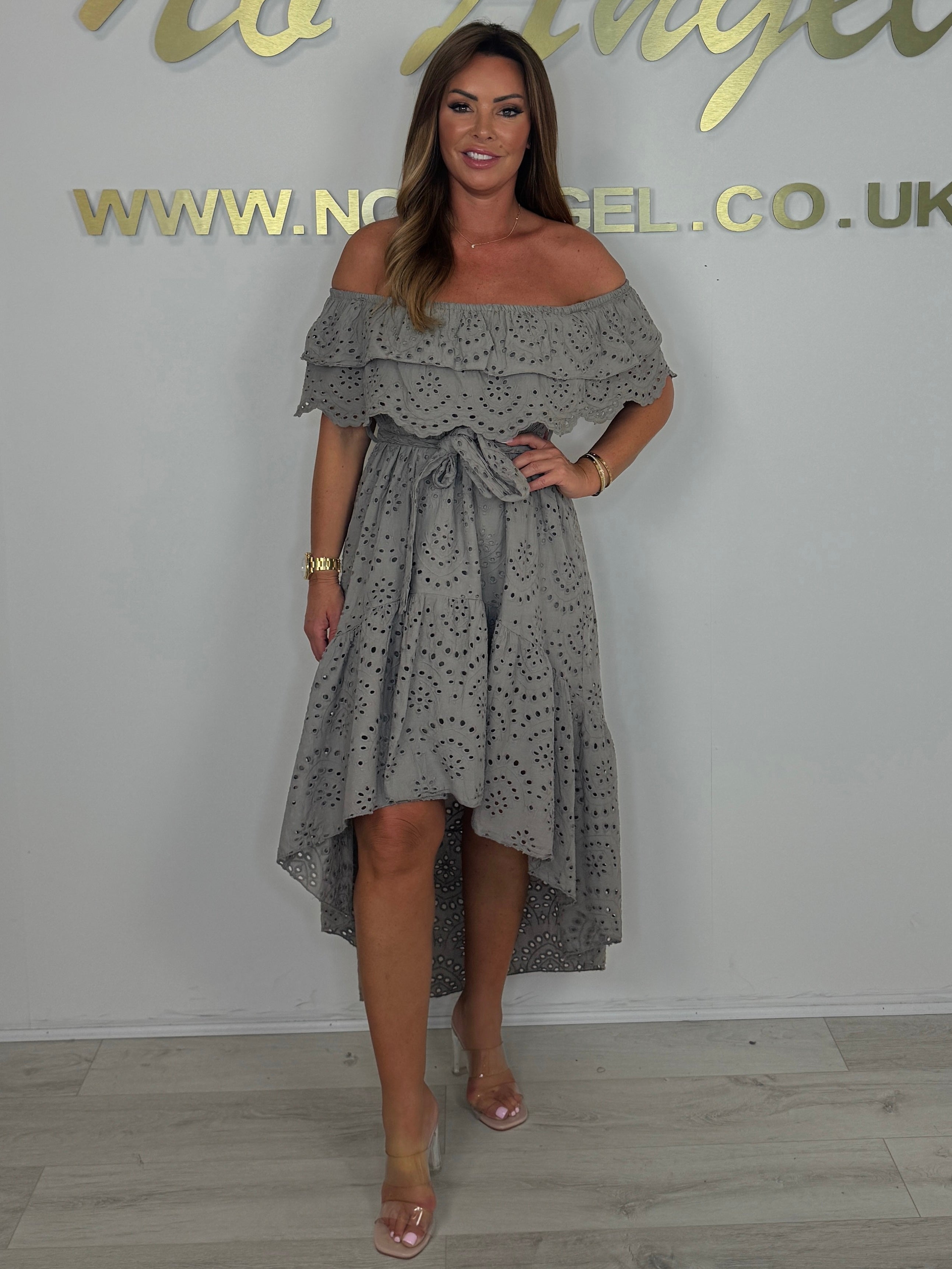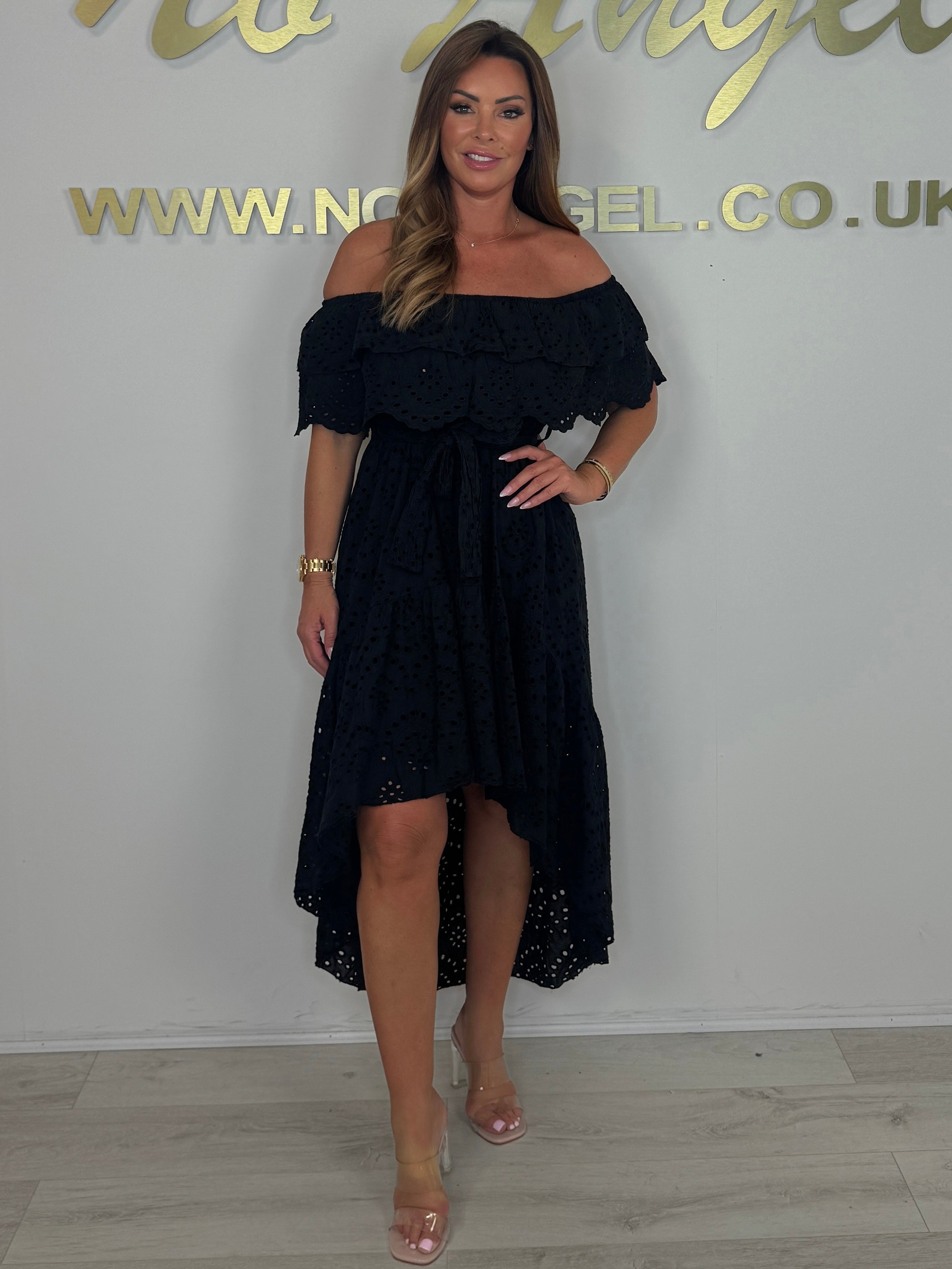 Embroidered Anglaise Laser Cut Bardot High Low Belted Dress (3 Colours)