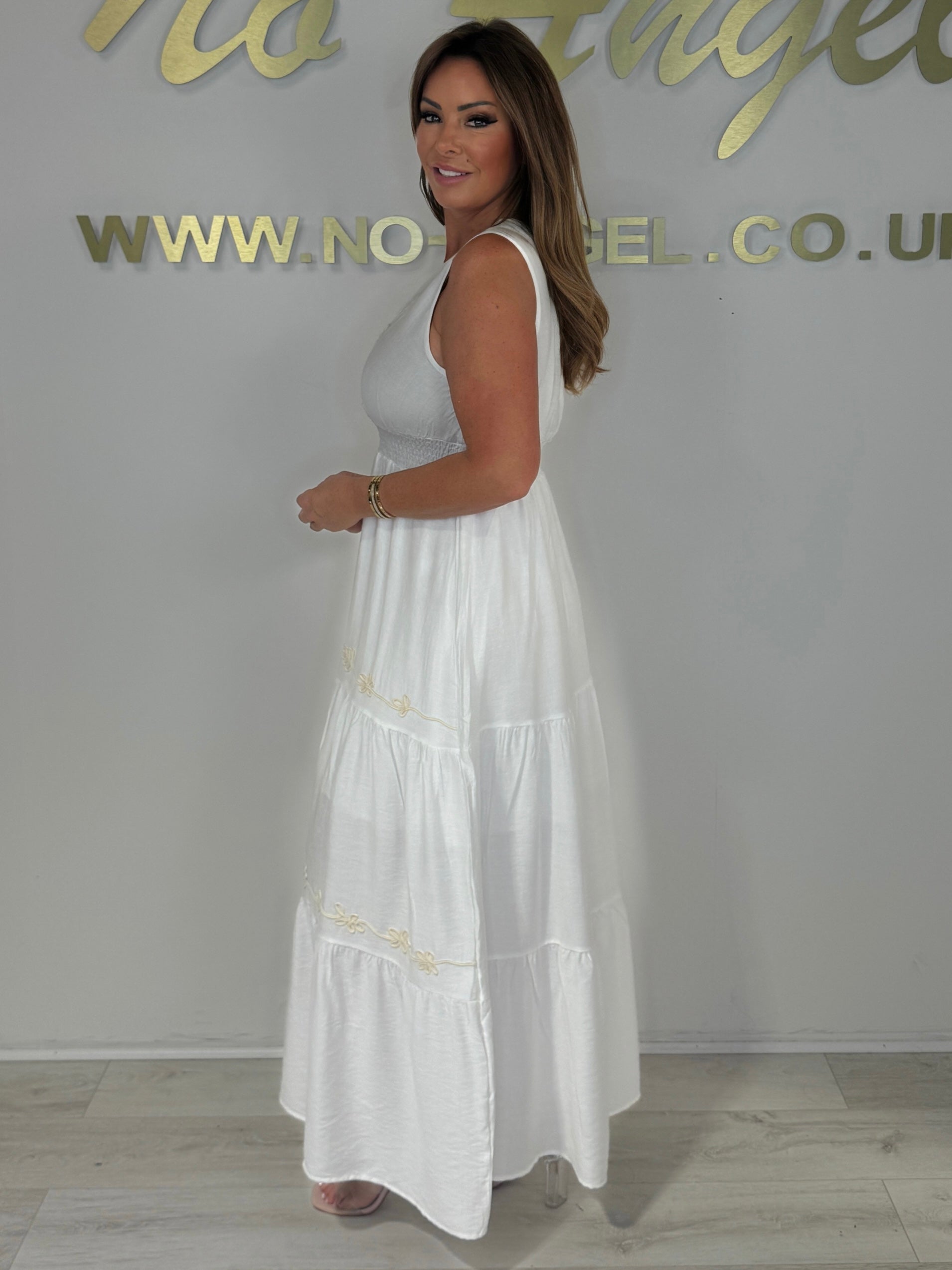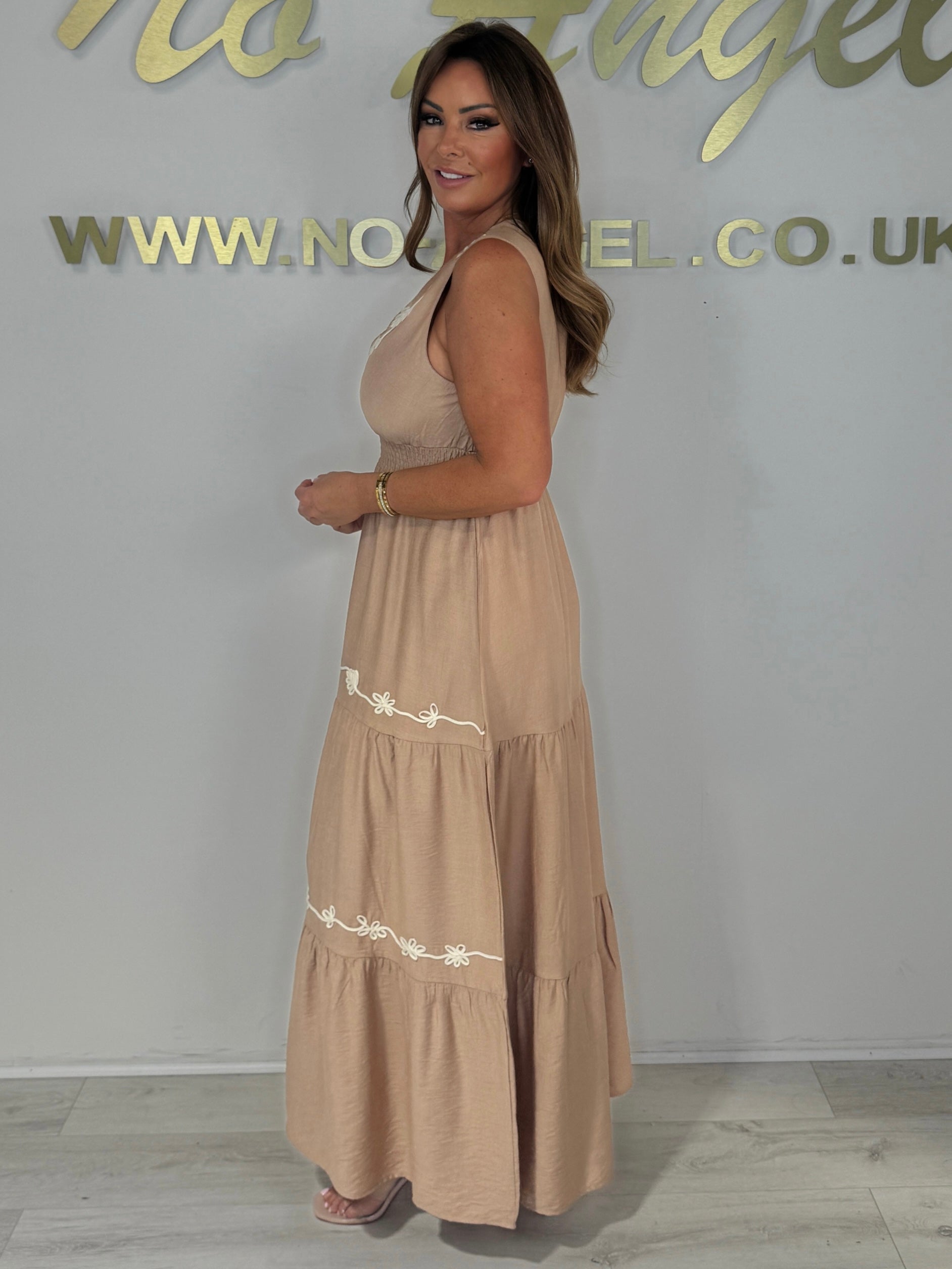 Linen Mix V-Neck Smocked Embroidered Detail Maxi Dress
