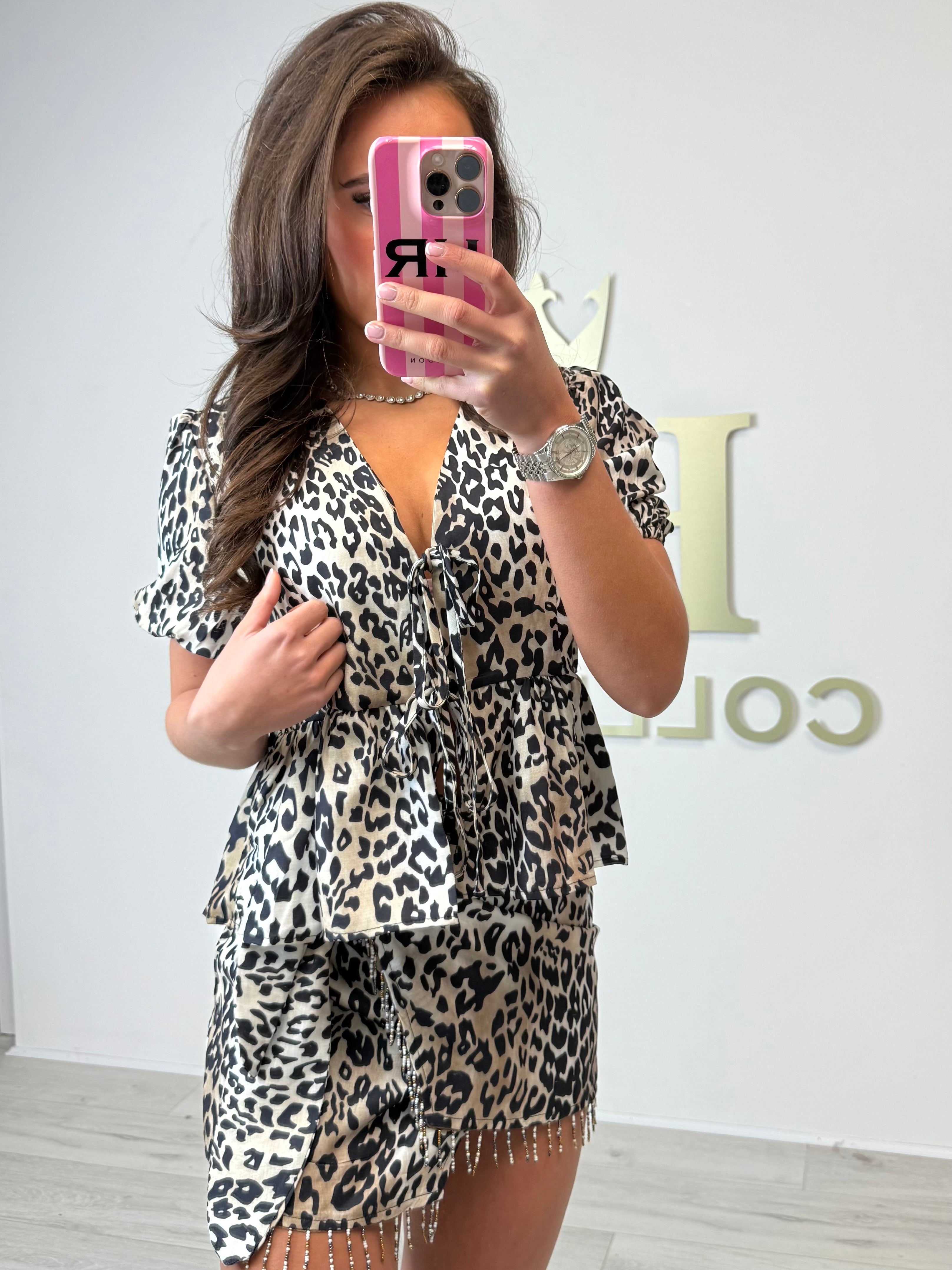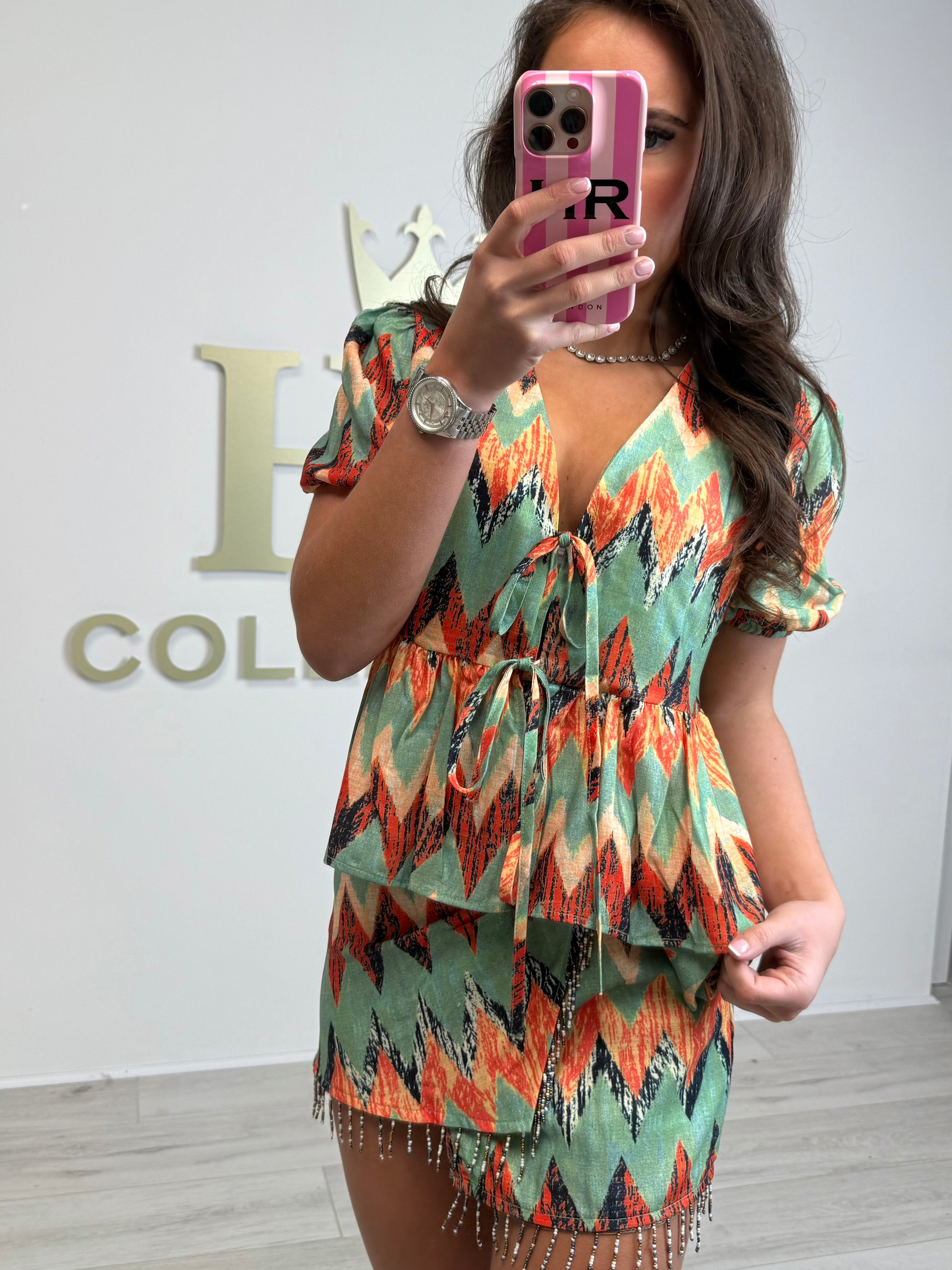 Puff Sleeve Tie Up Peplum Top & Tassel Wrap Skort