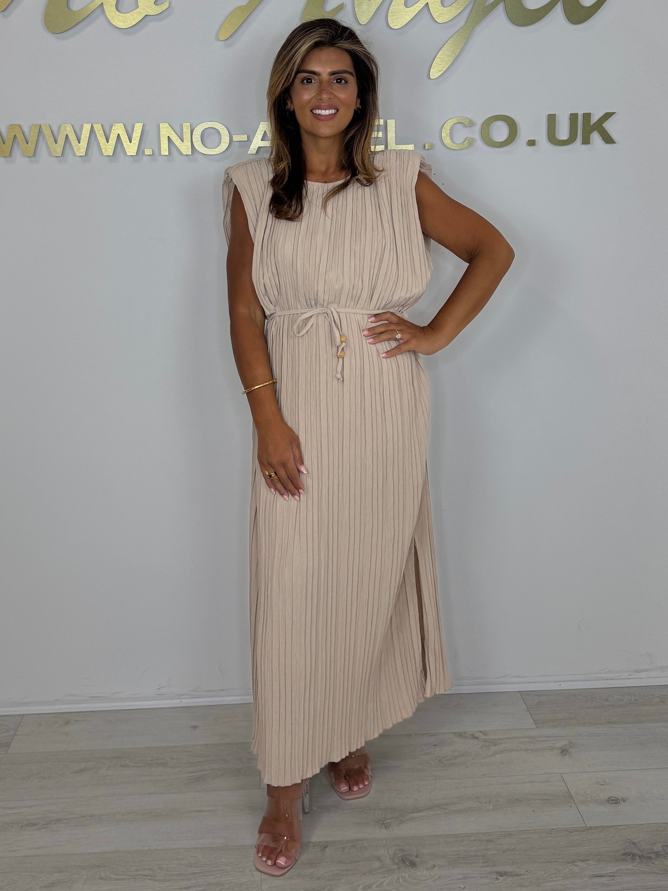 Shoulder Pad Pleated Tie Waist Maxi Dress