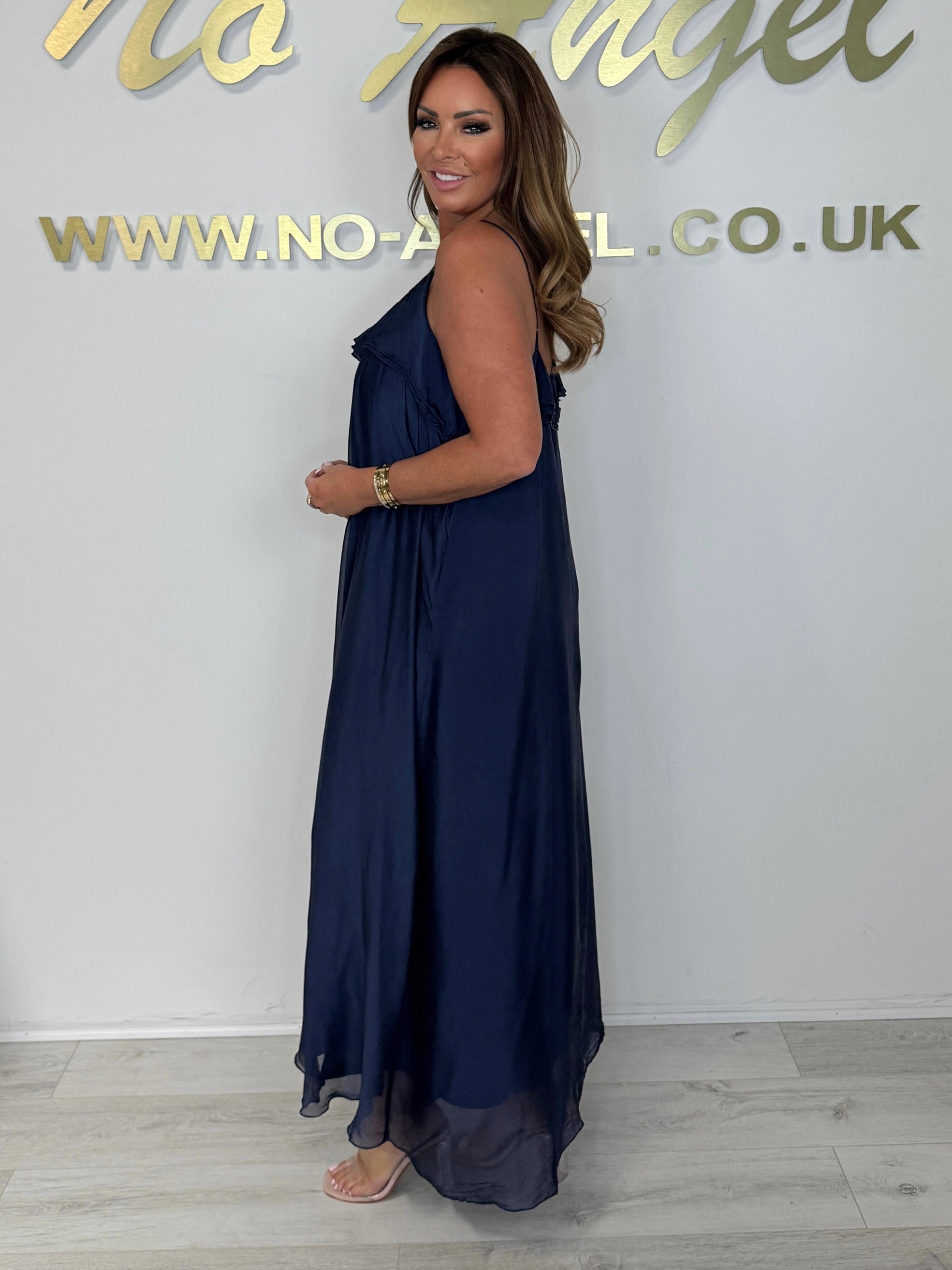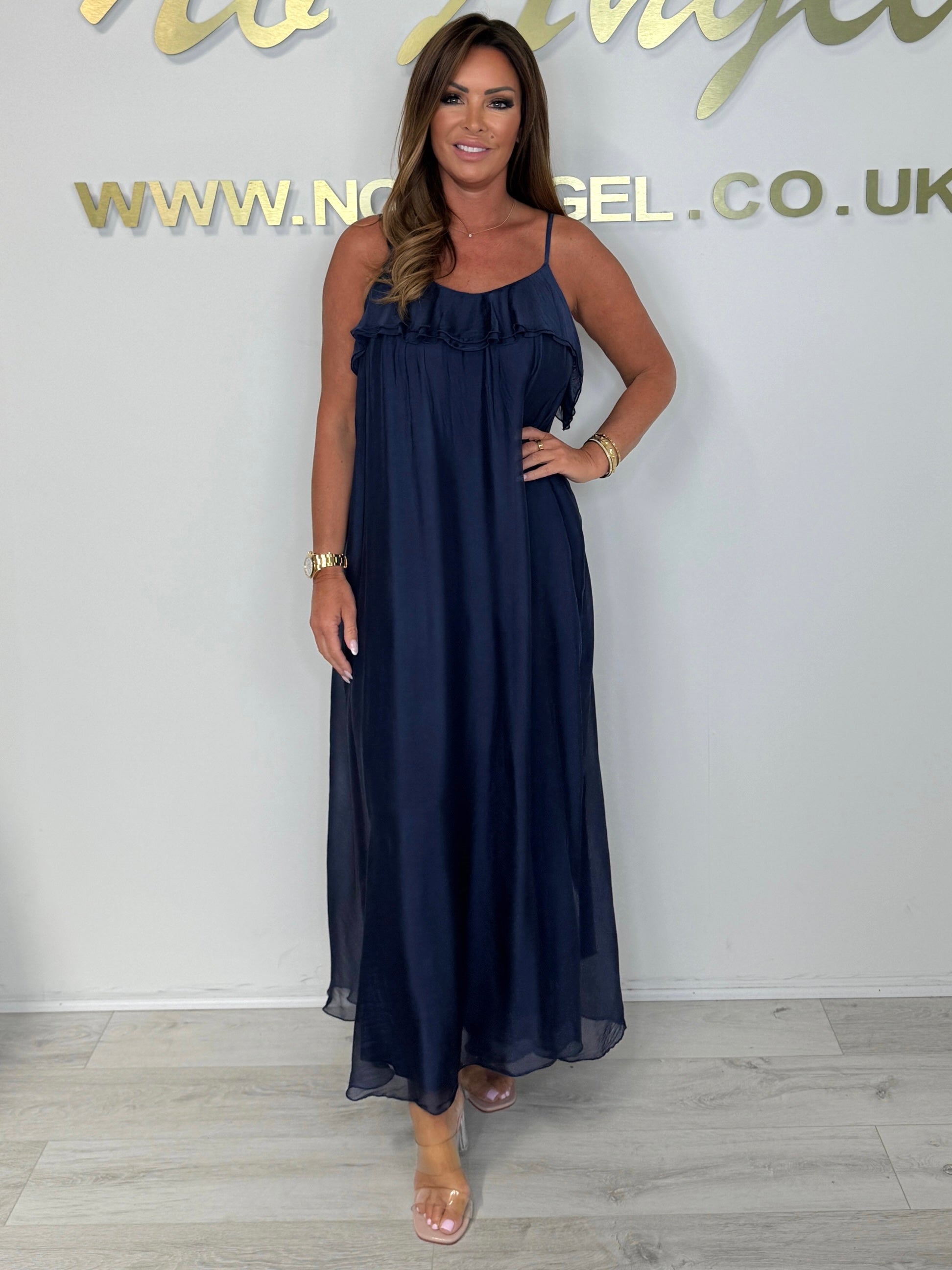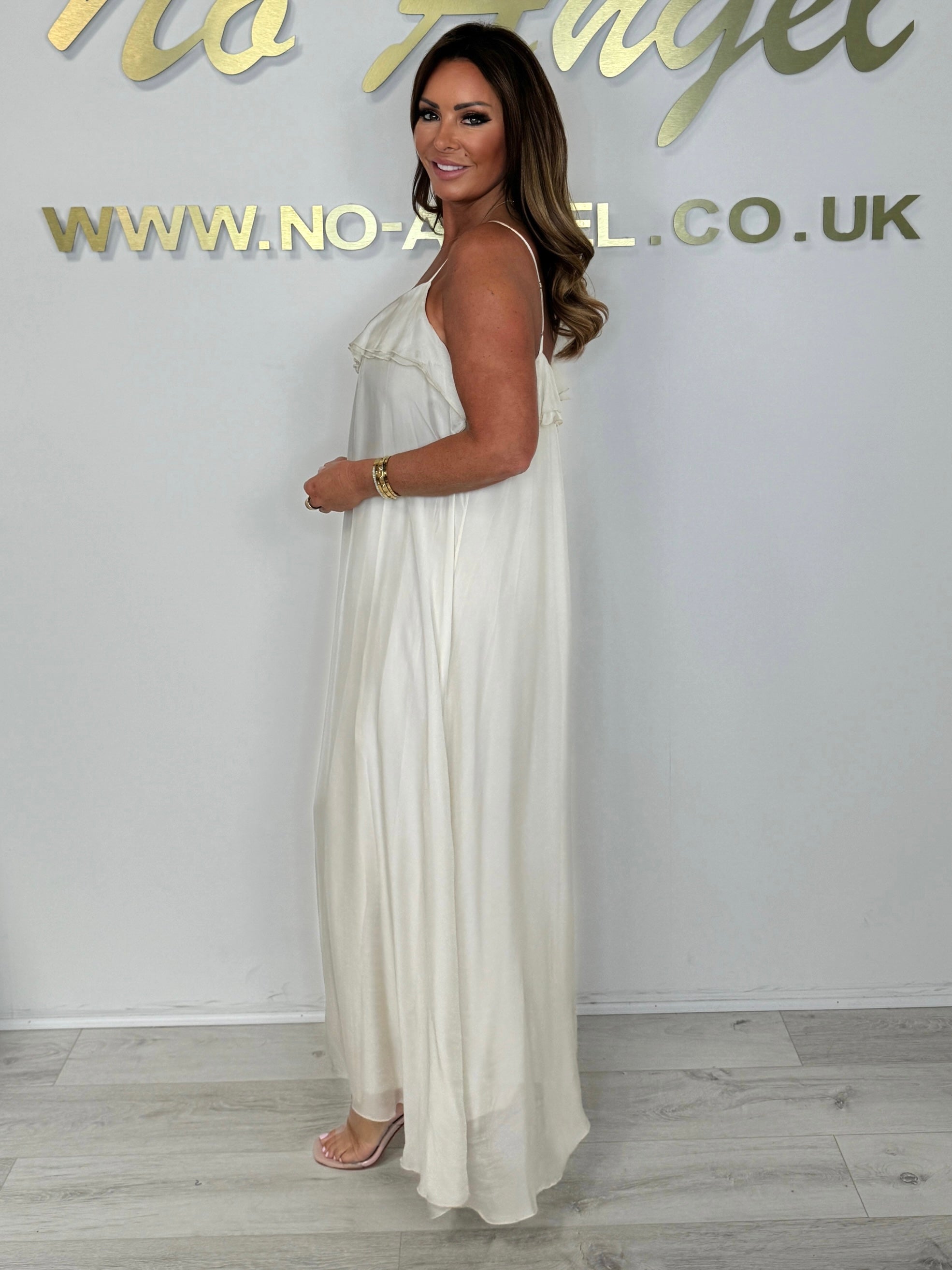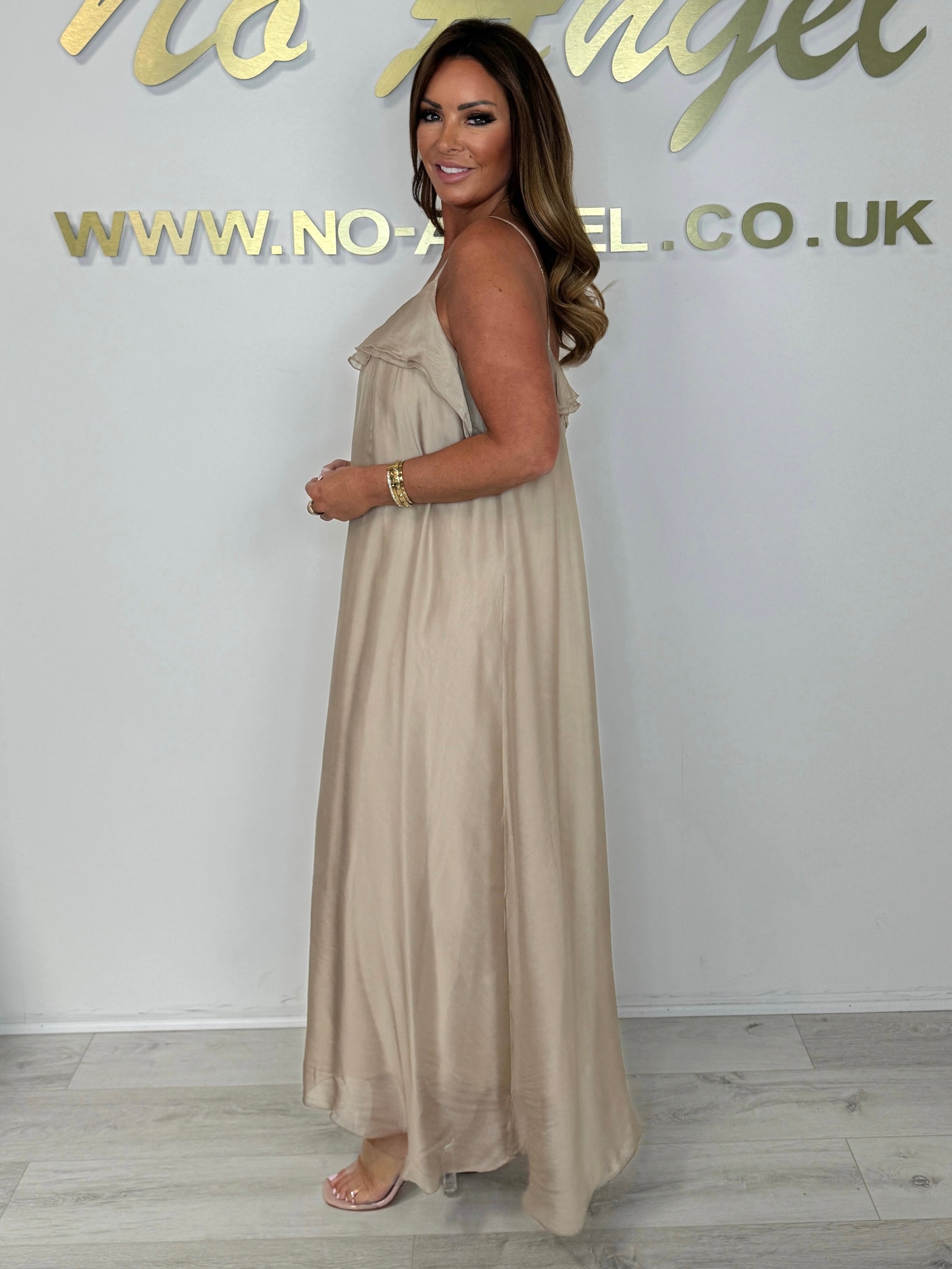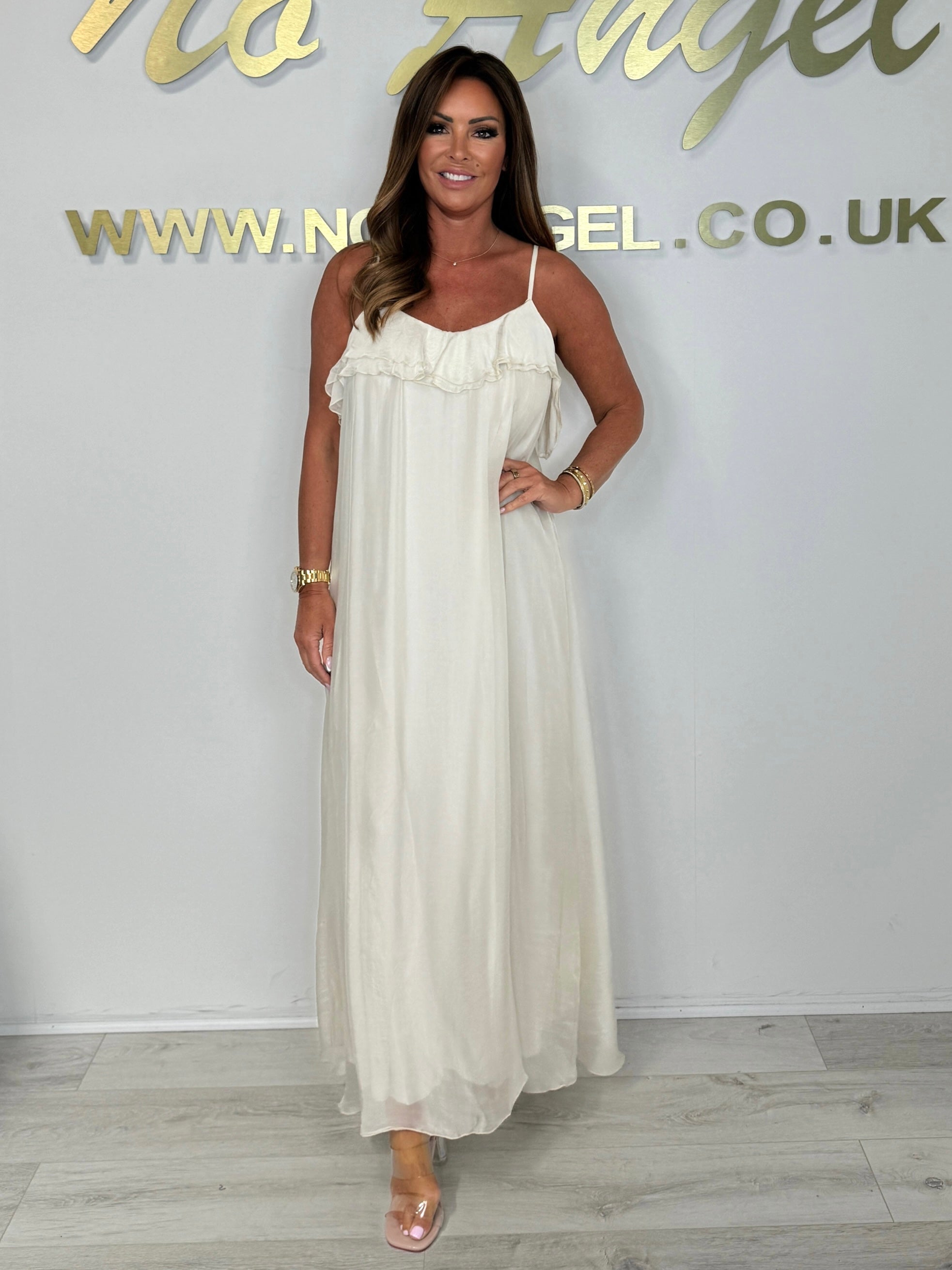 Silk Mix Spaghetti Strap Ruffle Maxi Dress