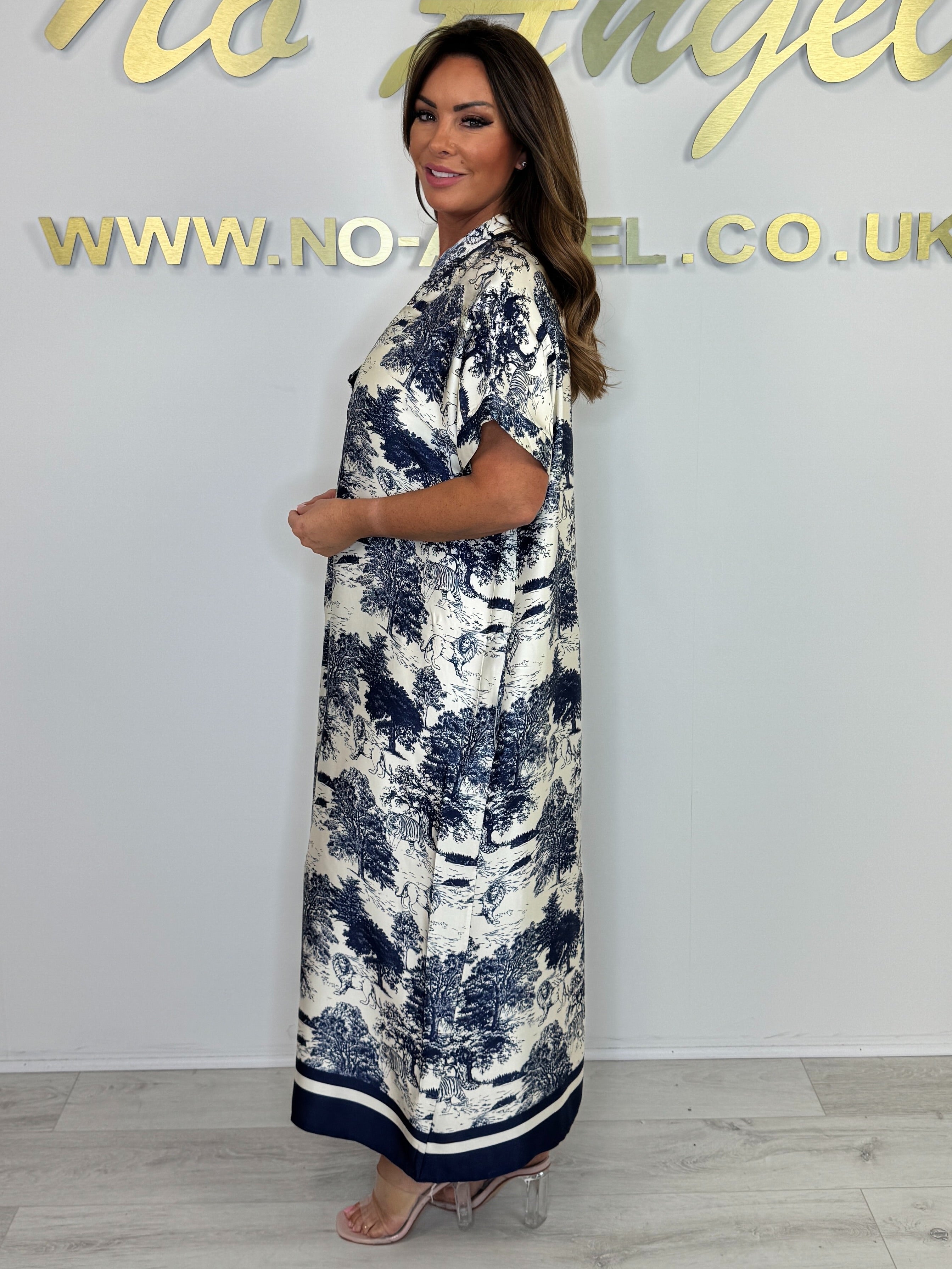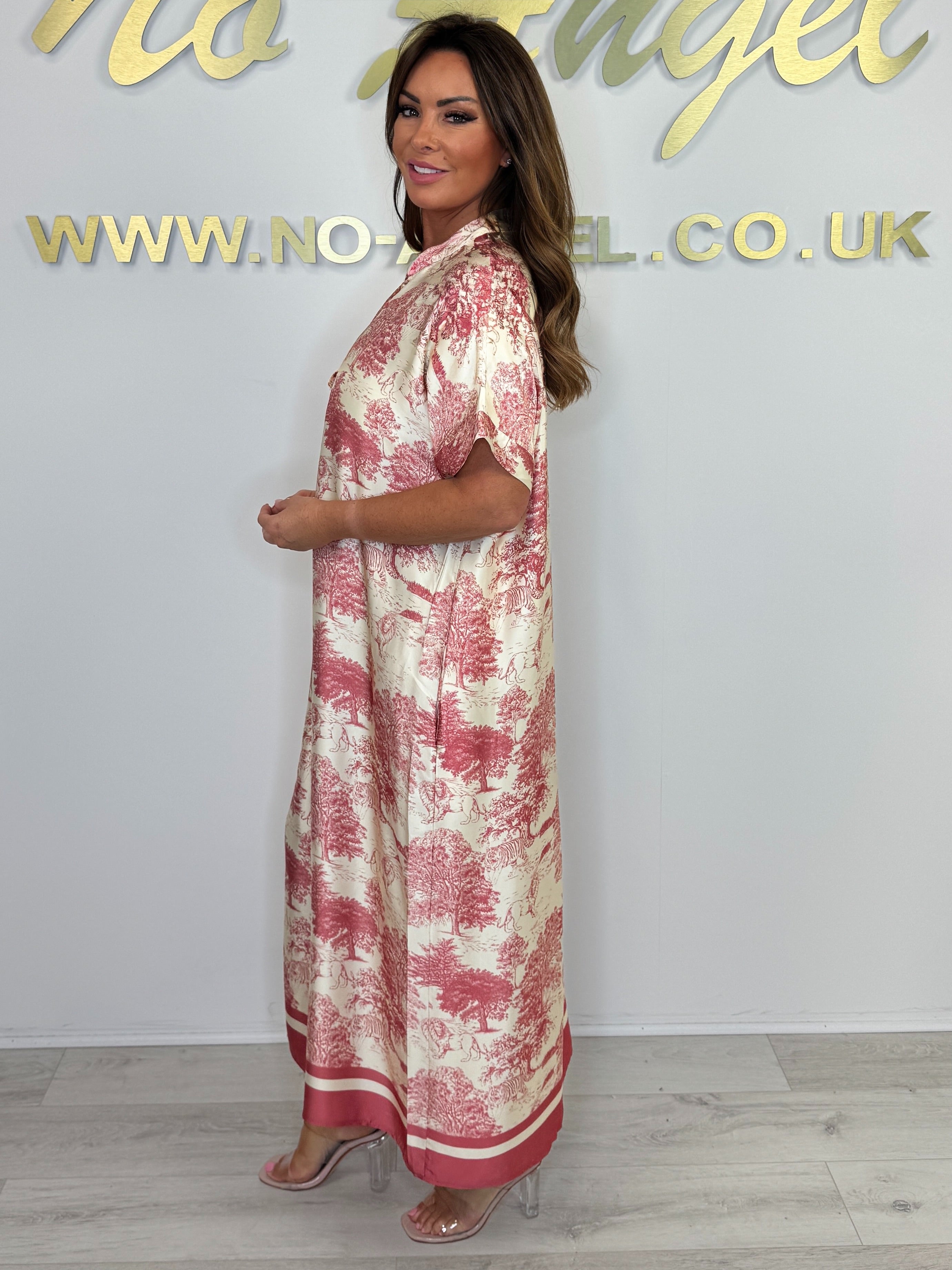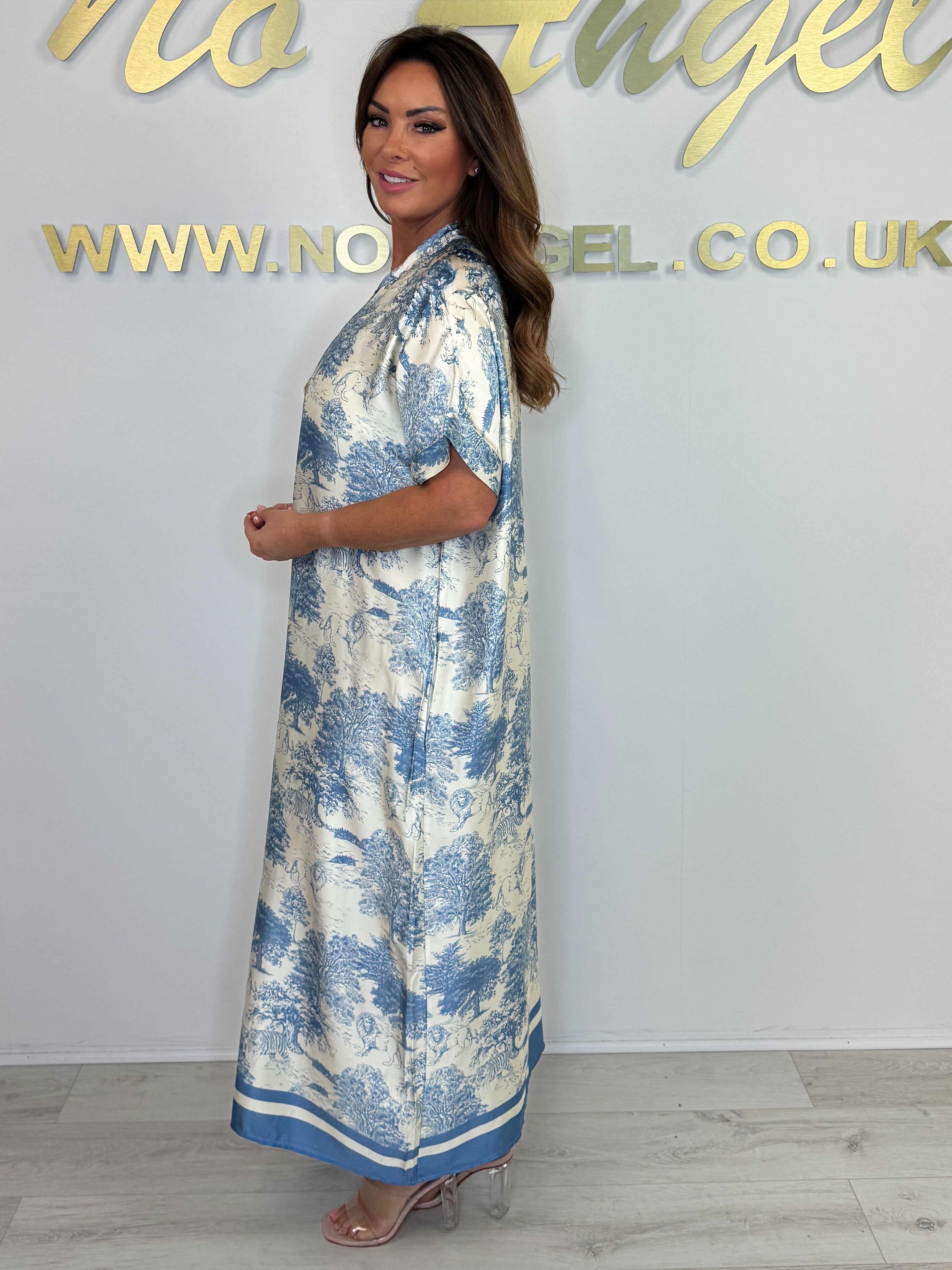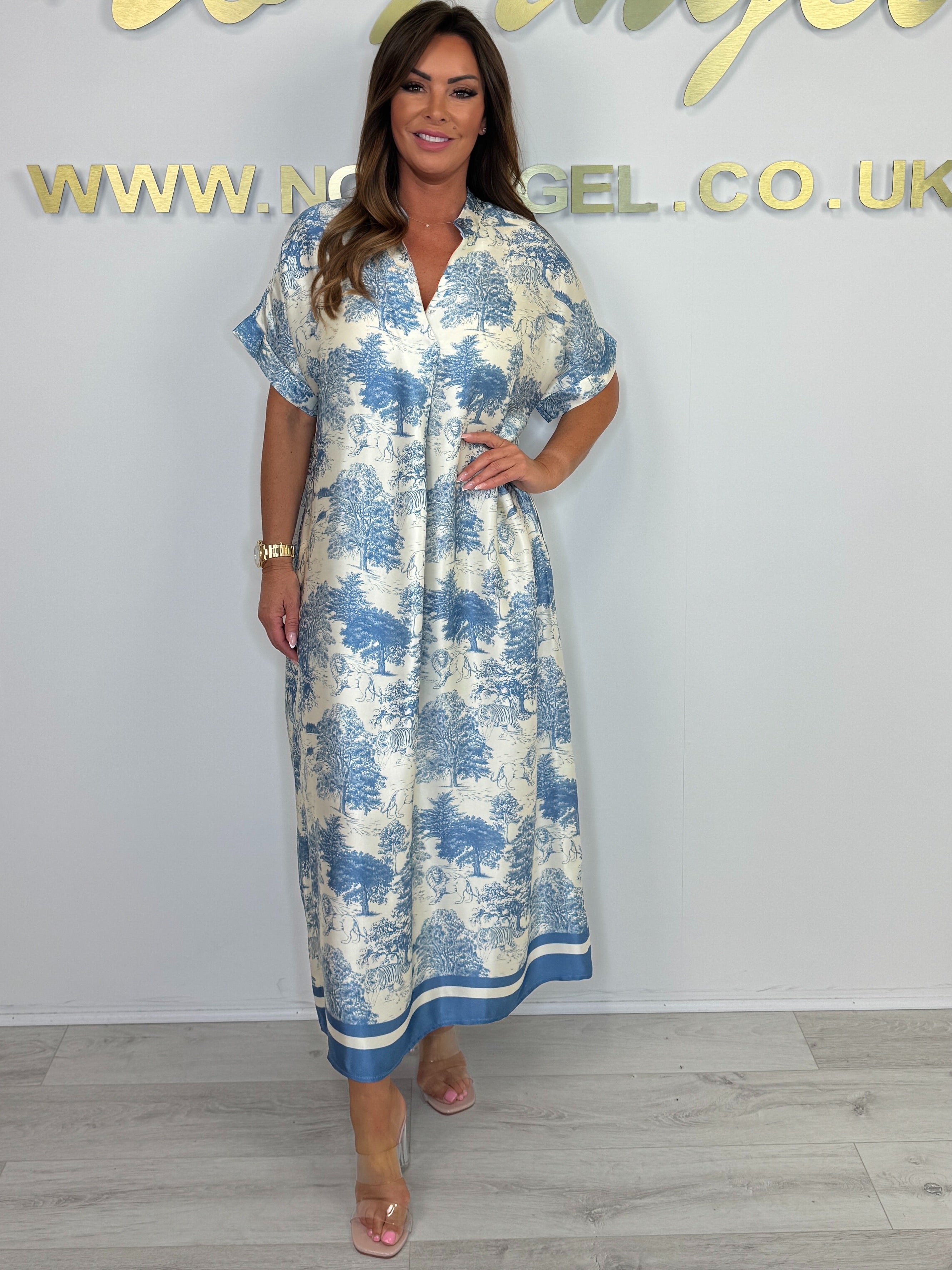 Silk Tree/Animal Pattern V-Neck Short Sleeve Maxi Dress
