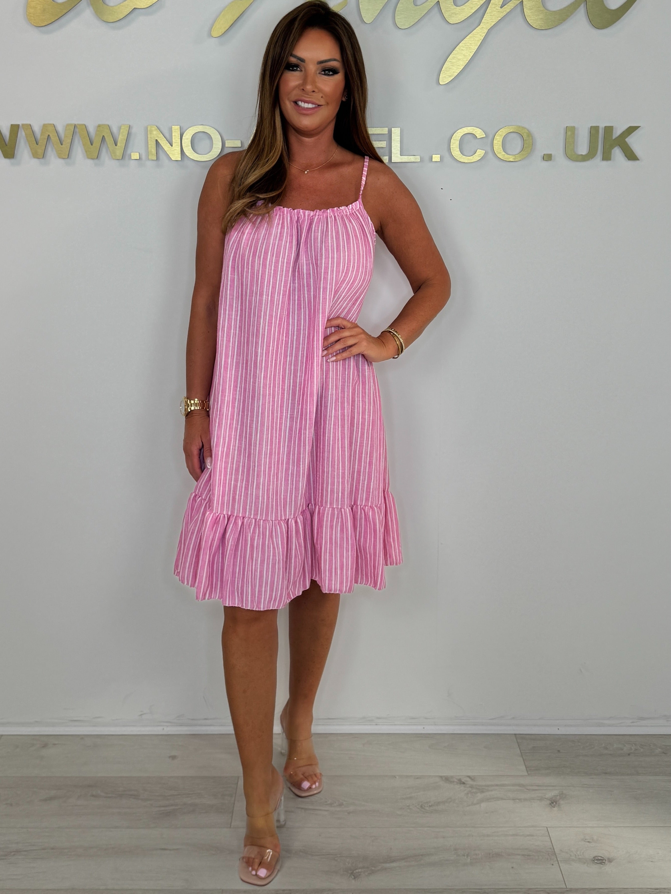 Stripe Linen Mix Spaghetti Strap Frill Trim Midi Dress