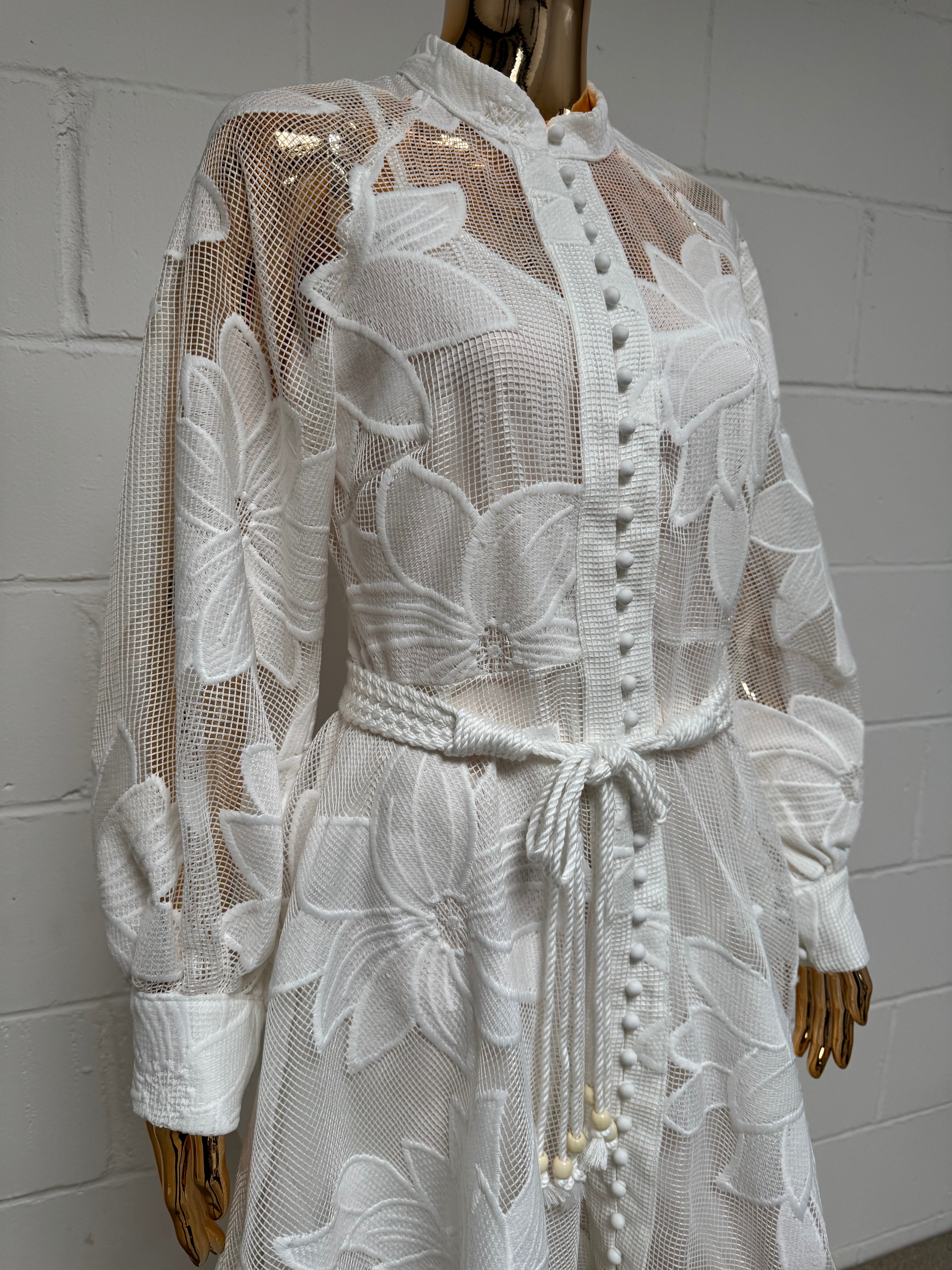 Sleeve Mesh Flower Detail Belted Button Up Dress